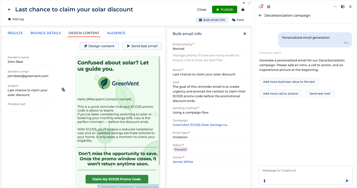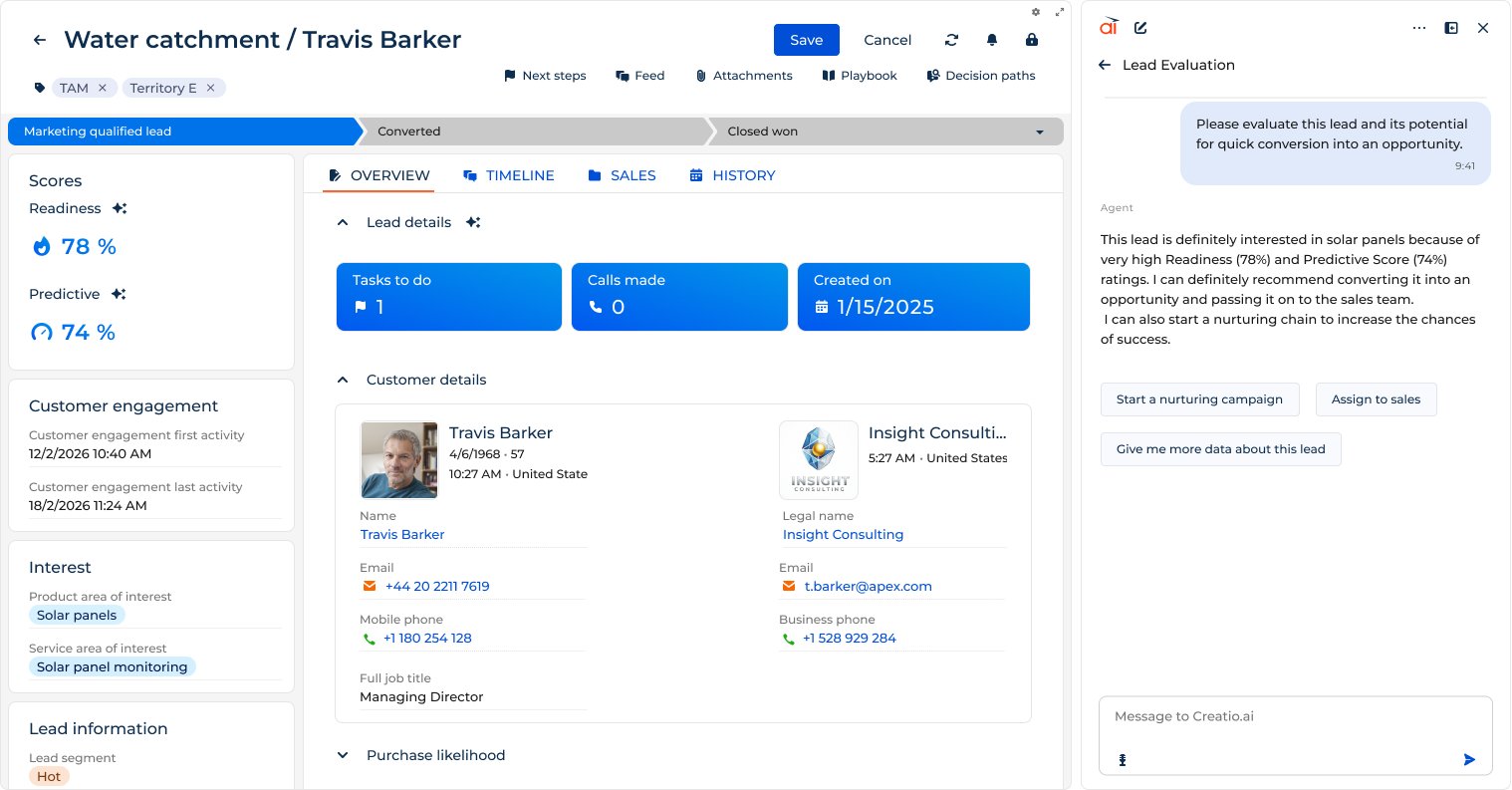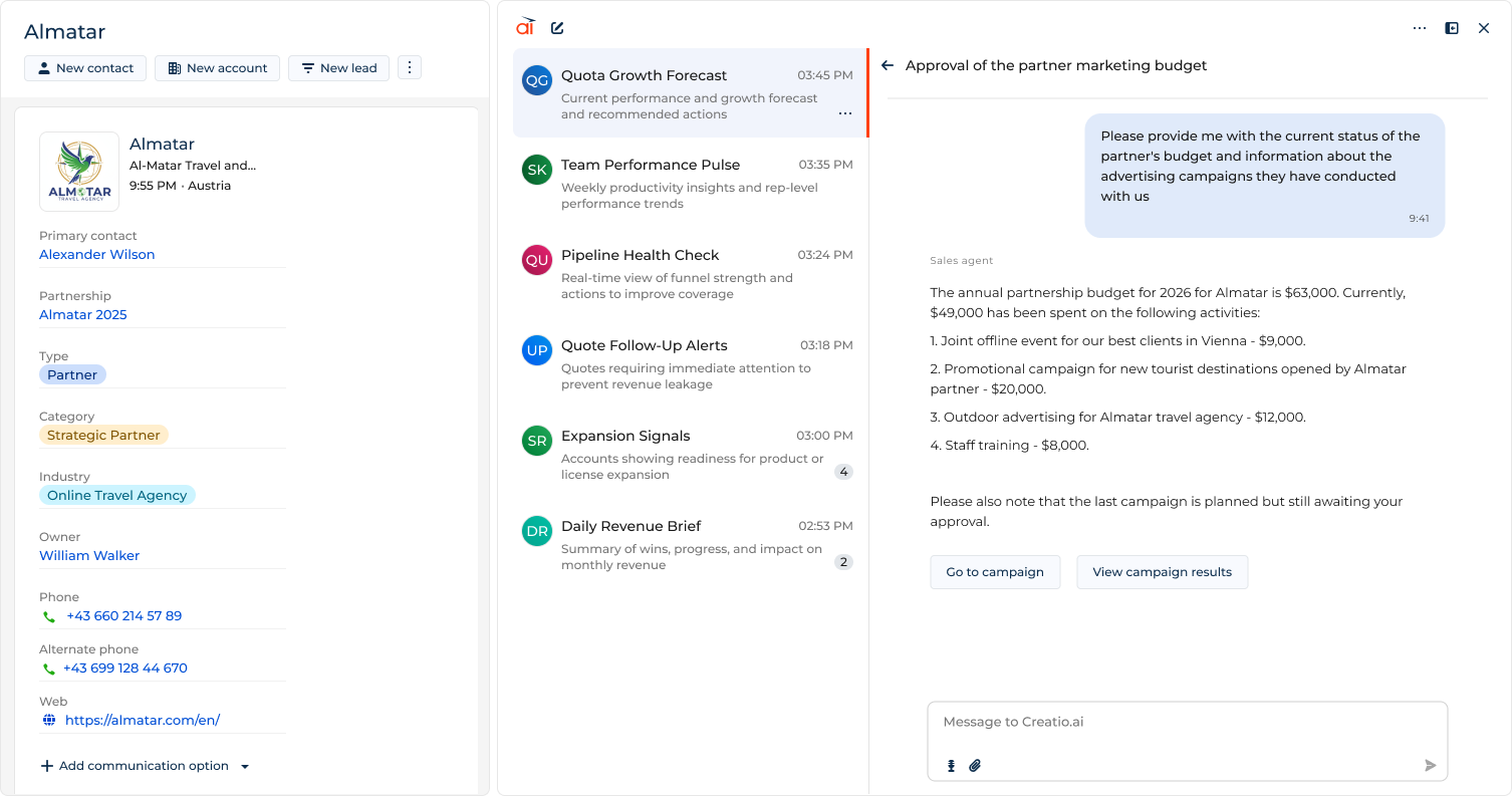 Creatio delivers the fastest time-to-value, reduced TCO, and immediate business impact through its agentic nocode platform, combining best-in-class CRM applications with ready-to-use AI agents.